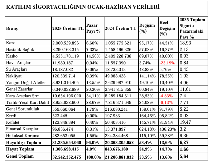 Katılım sigortacıları, 2025’in ilk yarısında 32.5 milyar TL prim üreterek, geçen yılın aynı dönemine göre üretimlerini yüzde 53,5 artırdı. Katılım sigortacılığının toplam sigorta pazarı içindeki payı yüzde 5,64 olarak gerçekleşti. katılım sigorta şirketlerinin bu yılın ilk yarısında en çok prim üretimi gerçekleştirdikleri branş, trafik sigortası oldu. Kaskoda ise katılım şirketleri yüzde 89,07 büyüdü.