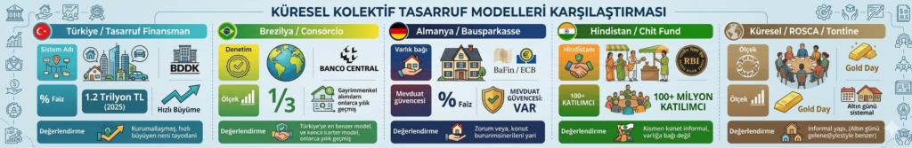 Türkiye modeli bu global tablo­da ilginç bir kesişim noktasında duruyor. Brezilya “Consórcio’su­nun” yapısal kardeşi, Alman “Ba­usparkasse’nin” ise ilham kayna­ğı olduğu söylenebilir. Yapısal ola­rak Türkiye’deki modelle en çok benzeşen sistem Brezilya. Consór­cio, ortak bir hedef doğrultusunda bir araya gelen katılımcıların, ay­lık taksitlerini biriktirdiği kapalı bir havuz sistemidir. Yönetici şir­ket, kredi mektuplarını kura ile da­ğıtır; faiz yoktur, yalnızca yönetim ücreti alınır. The Brazil Business Banco Central do Brasil sistemi düzenlemekte ve denetlemekte­dir. Tipik bir “consórcio” 300 katı­lımcıyı ve 60 aylık bir dönemi kap­sayabilmekte.