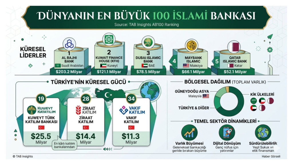 TAB Insights tarafından yayınlanan “AB100: Dünyanın En Büyük İslami Bankaları” raporu, küresel faizsiz finans sektöründeki güç dengelerini ortaya koydu. Suudi Arabistan liderliğini korurken, Türkiye’den üç dev banka dünya listesinde üst sıralarda yer alarak dikkatleri üzerine çekti.